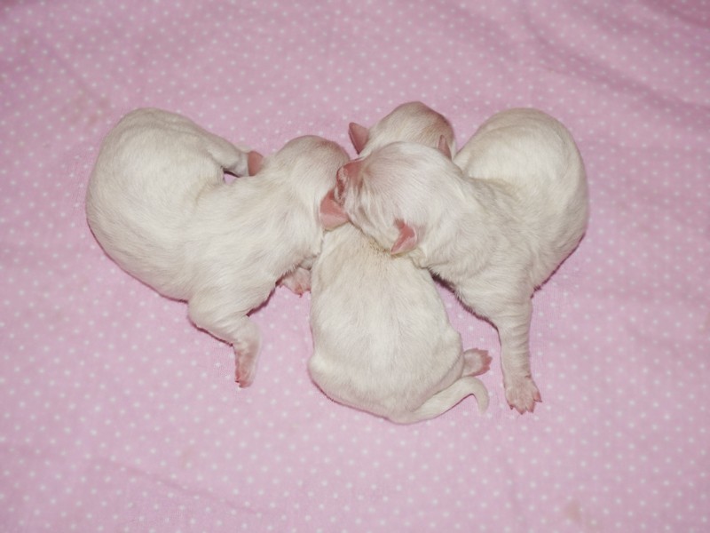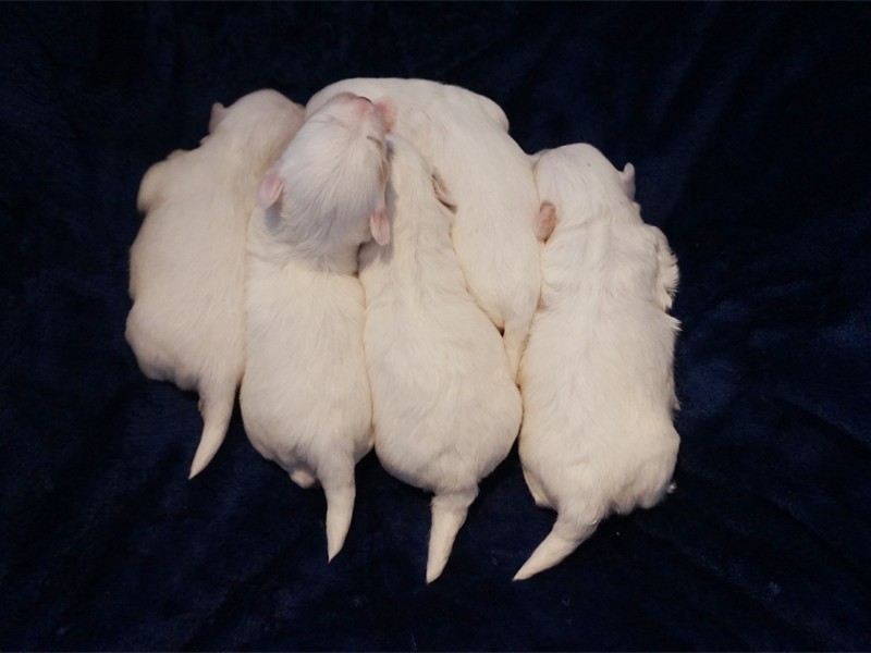 Miot O - ROXANNE z dnia 9 czerwca 2024 roku. Cztery samce i jedna suczka. Wszystkie białe.